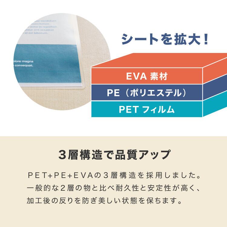 PET+PE+EVAの3層構造を採用し、耐久性と安定性を確保。ラミネート後の反りを防ぎ、長期間美しい状態を保ちます。