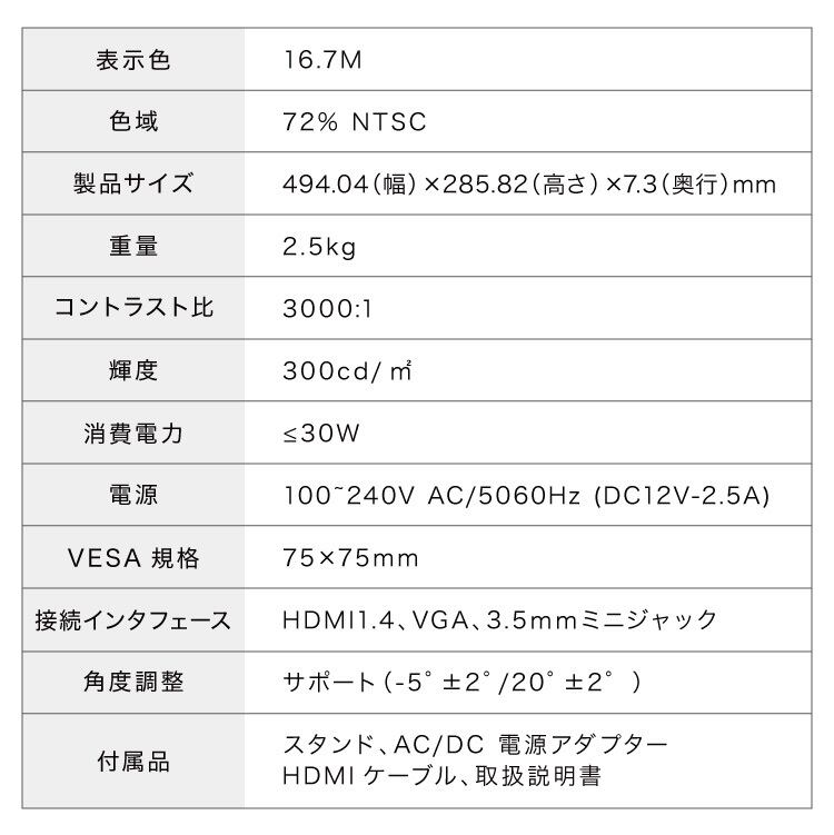 接続インタフェース:HDMI1.4、VGA、3.5mmミニジャック