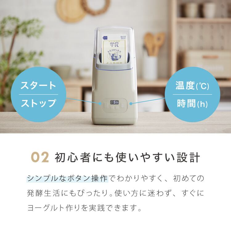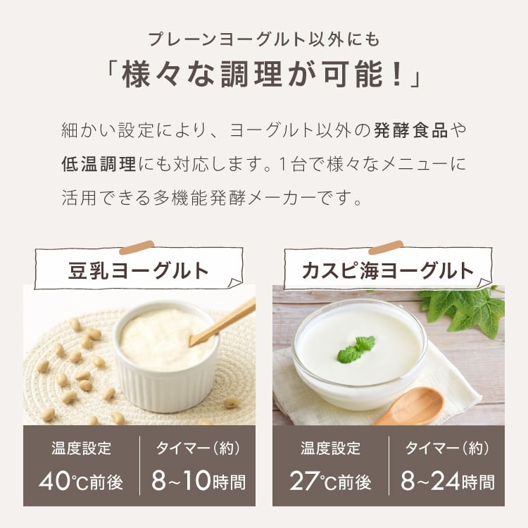発酵食品に欠かせない温度管理を1℃刻みで細かく設定可能。ヨーグルトから甘酒、塩麹、納豆まで幅広く対応。
