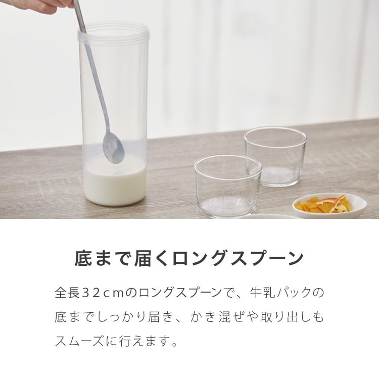 届いたその日からすぐに発酵が始められる、充実の付属品セット付き!内容は、容量1Lの専用容器、封口クリップ、計量カップ、そして特に注目すべきは全長32cmの304ステンレス製ロングスプーン。牛乳パックや深めの容器の底までしっかり届く長さで、ヨーグルトや甘酒のかき混ぜや取り出しがスムーズ。錆びにくく丈夫で衛生的な本格仕様で、他のヨーグルトメーカーではあまり見られないワンランク上の付属品です。
