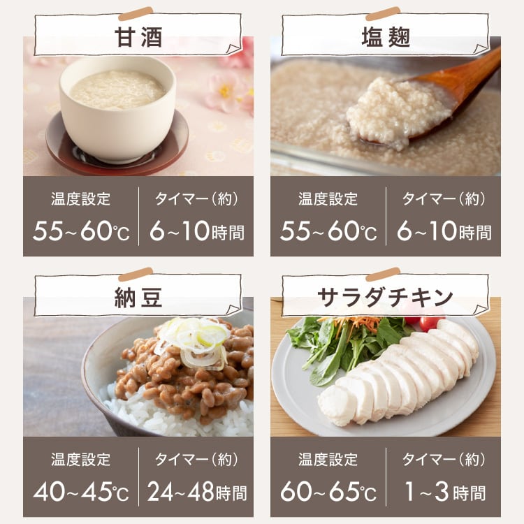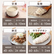 ヨーグルトだけでなく、甘酒、塩麹、納豆、テンペ、酵母発酵、味噌などの発酵食品にも対応可能。65℃設定で低温調理(低温加熱の鶏むね肉、サラダチキンなど)にも活用できます。