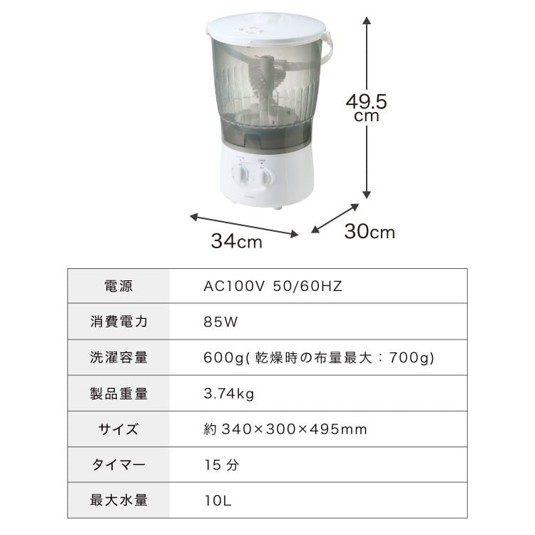 コンパクトながら、最大2kgまでの洗濯が可能。日常の小物洗いや少量の洗濯に最適です。